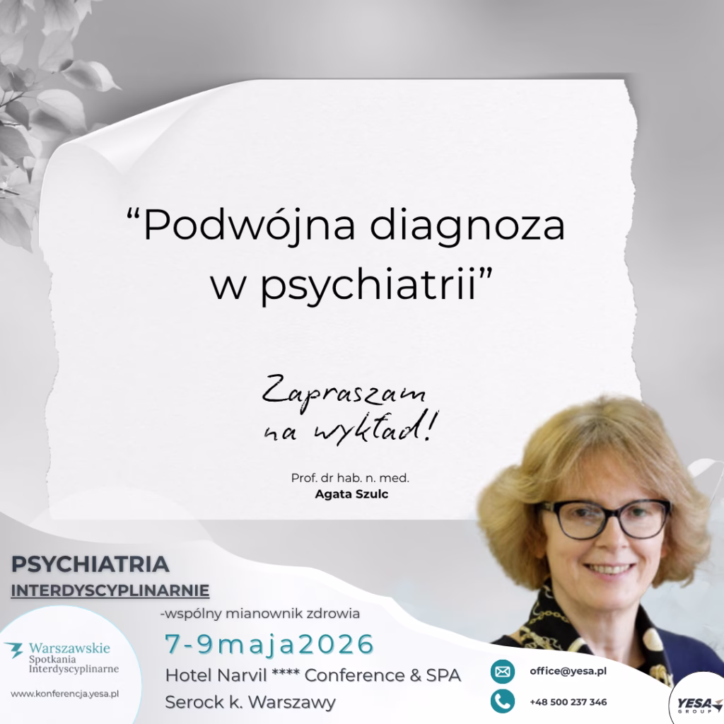 “Podwójna diagnoza w psychiatrii” tematem jednego z wykładów podczas Warszawskich Spotkań Interdyscyplinarnych w dniach 7-9 maja 2026. Wykład poprowadzi Prof. dr hab. n. med. Agata Szulc Zobaczcie program konferencji – https://konferencja.yesa.pl/program/ Zapraszamy do rejestracji! https://konferencja.yesa.pl/rejestracja/